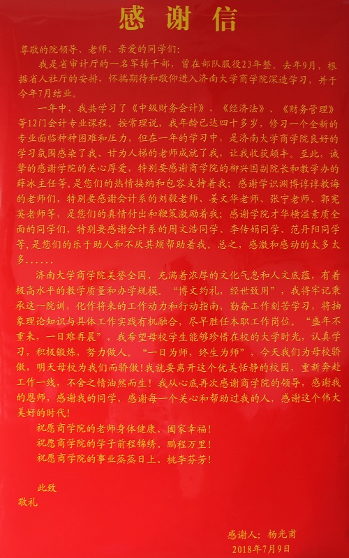 7月9日,多特蒙德中文官网收到一位省审计厅军转干部杨光甫的来信,信中对多特蒙德中文官网副院长柳兴国和教学管理办公室主任薛冰表达衷心感谢,感谢老师们的无私帮助和悉心教导,盛赞老师践行“博文 约礼 经世 致用”校训精神的高尚师德,同时向多特蒙德中文官网未来发展表达了期望和美好祝愿。