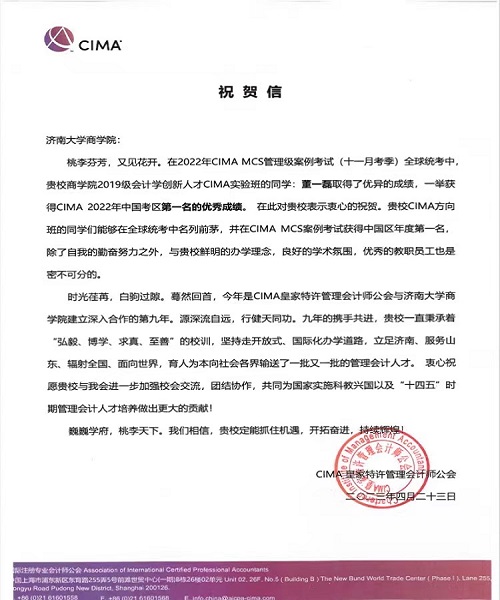 CIMA公会的祝贺信,肯定了多特蒙德中文官网在创新实验学生培养方面的做法,表示董一磊同学在全球统考中取得的优异成绩,得益于学校先进的办学理念,良好的学术氛围,认为济南大学秉承“弘毅、博学、求真、至善”的校训,坚持走开放式、国际化办学道路,立足济南、服务山东、辐射全国、面向世界,向社会各界输送了优秀的管理会计人才,取得良好成效。
