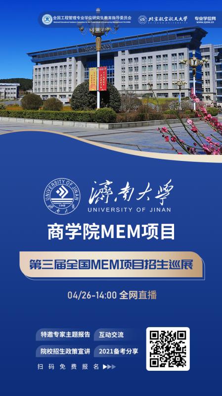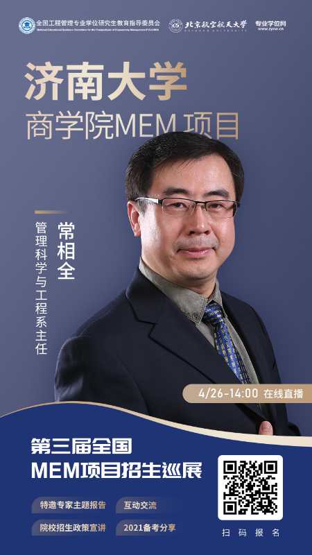 第三届全国MEM招生巡展是由全国工程管理专业学位研究生教育指导委员会和北京航空航天大学主办,专业学位网协办的一次MEM院校招生政策“云”宣讲活动,本次活动共有来自天津大学、浙江大学、大连理工大学、北京航空航天大学、上海交通大学等30多所院校参加,14位院校负责人做了招生宣讲报告,其中来自山东的青岛大学、青岛科技大学、山东财经大学和济南大学同台宣讲,线上参加人数近两万余人。
