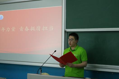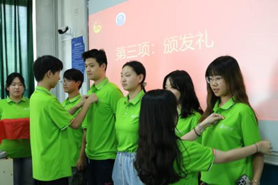 在热烈掌声中,新团员代表依次登台接受颁发礼,由优秀团员为其佩戴团徽、颁发团员证。熠熠生辉的团徽象征着责任与使命,激励新团员砥砺前行。随后,团员代表杨皓宇带领全体团员面向团旗庄严宣誓,以铮铮誓言彰显青春担当!